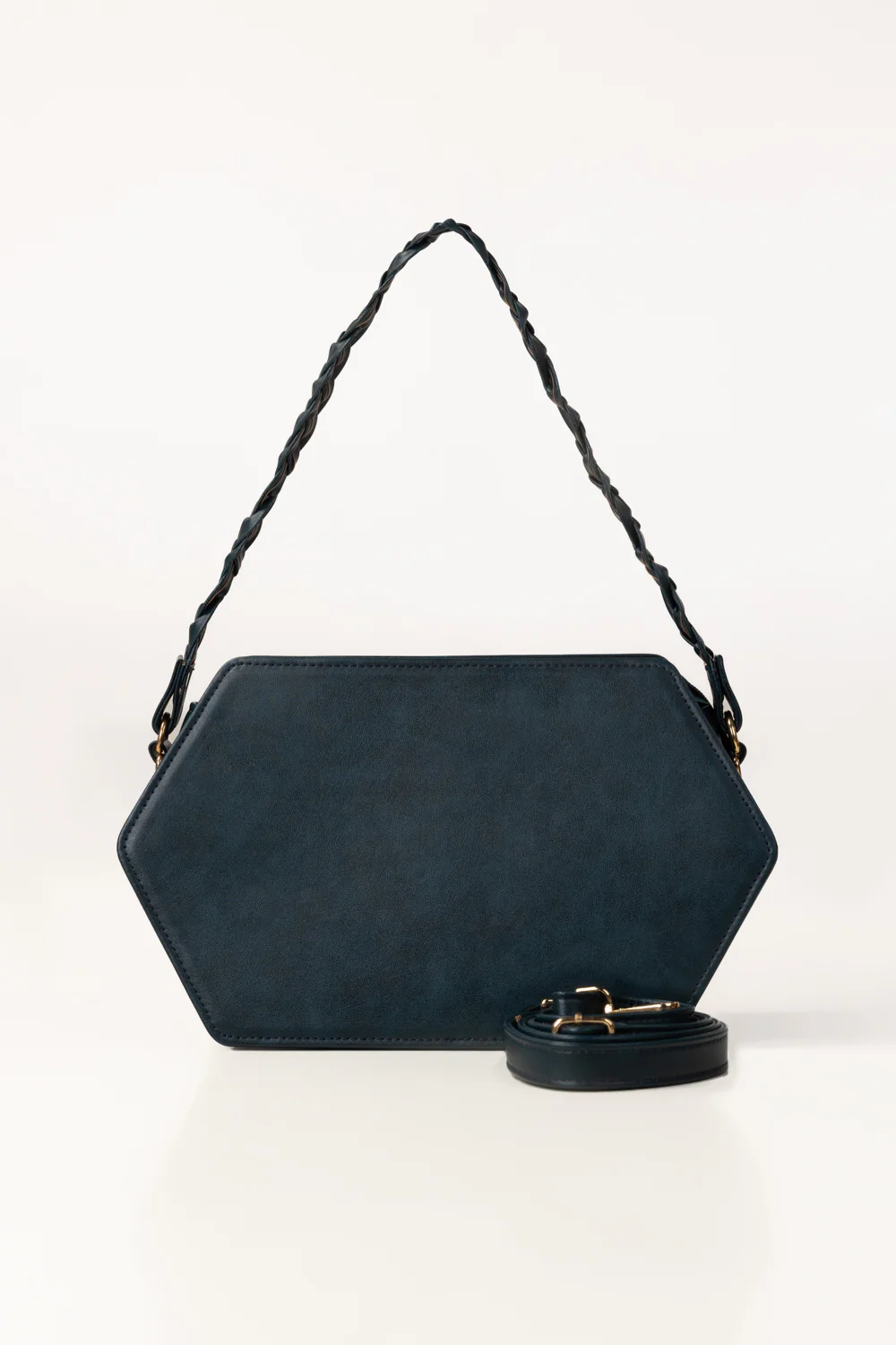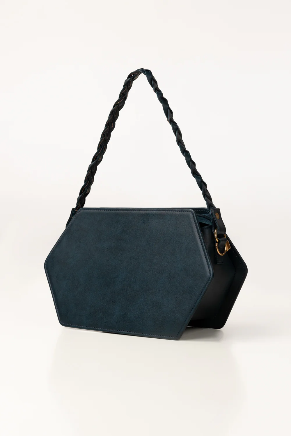 A contemporary statement bag crafted from faux leather, featuring a distinctive geometric silhouette and a braided top handle with sleek hardware. Designed to balance structure and space, it offers a polished yet versatile look that transitions effortlessly from everyday wear to semi-formal occasions.