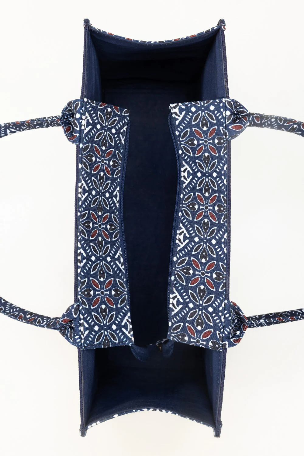 This canvas tote features flower embroidery with matching cultural printed handles for a coordinated look. Lightweight yet spacious, it comfortably carries daily essentials and includes a matching zip pouch for easy organization.